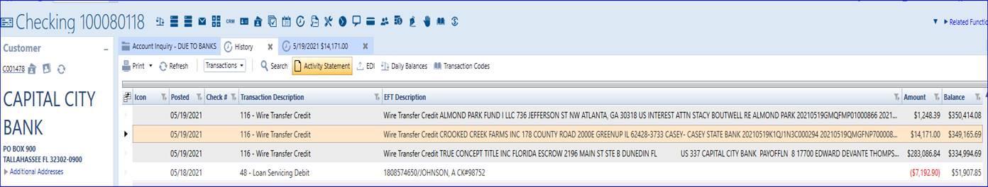 To verify if a wire for credit to a loan has been received, inquire on the Wire Settlement DDA # 100080118. Have the client confirm the following: