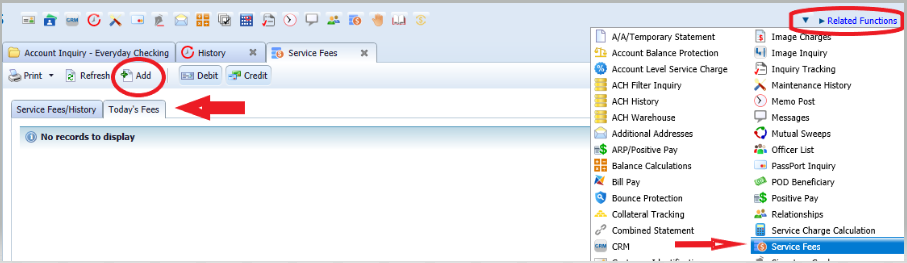 - From the Customer & Account Inquiry screen, click Related Functions > Service Fees.