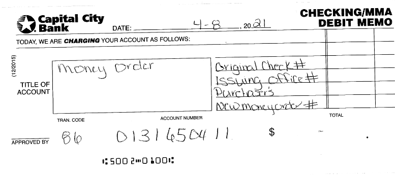 - Account name - Money Order Demand Deposit Account (DDA) Account