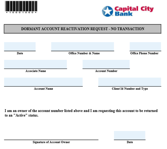 - Complete the Dormant Account Reactivation Request-No Transaction Form.